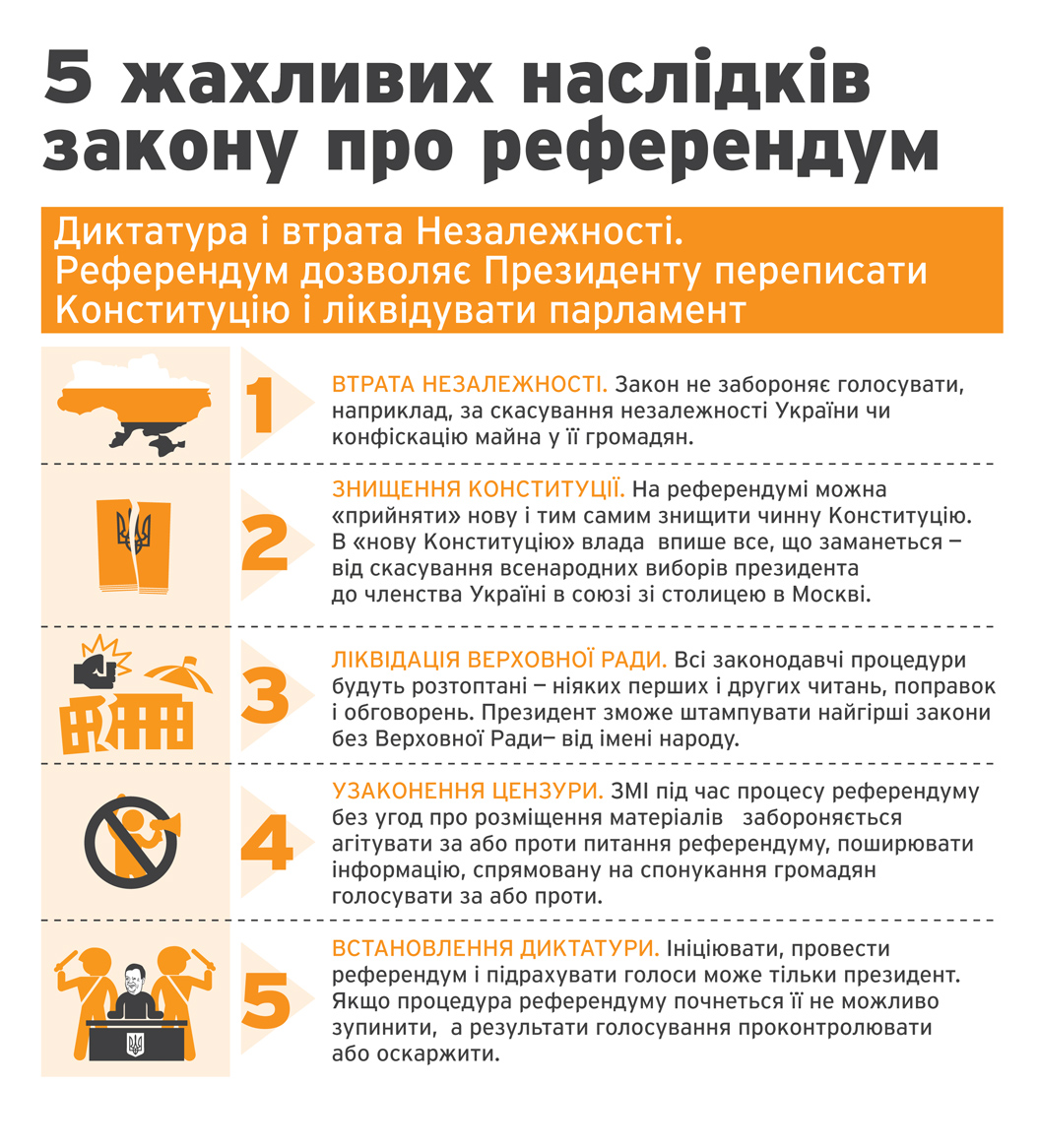 Громадські організації закликали опозицію зробити все можливе для відміни нещодавно прийнятого закону «Про всеукраїнський референдум», за допомогою якого, прикриваючись волевиявленням народу, влада може не тільки нівелювати Верховну Раду як законодавчий орган, а й внести зміни до Конституції, включити Україну до Митного союзу та, навіть, приєднати її до Росії.