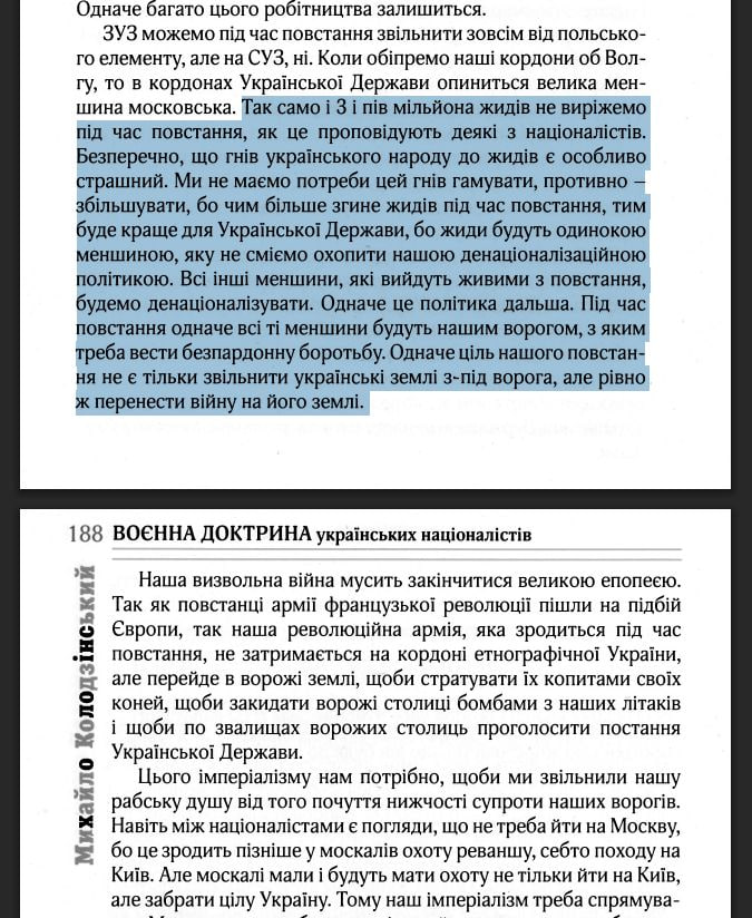 «Безперечно, що гнів українського народу до Ж***в буде особливо страшний. Ми не маємо потреби цей гнів гамувати, противно, ще побільшувати, бо чим більше згине Ж***в під час повстання, тим буде краще для української держави, бо Ж**и будуть одинокою меншиною, яку не сміємо обхопити нашою денаціоналізаційною політикою. Всі інші меншини, які вийдуть живими з повстання, будемо денаціоналізувати. Одначе це політика дальша. Під час повстання, одначе, всі ті меншини будуть нашим ворогом, з яким треба вести безпардонну боротьбу» («Военная доктрина украинских националистов», 1938 год)».